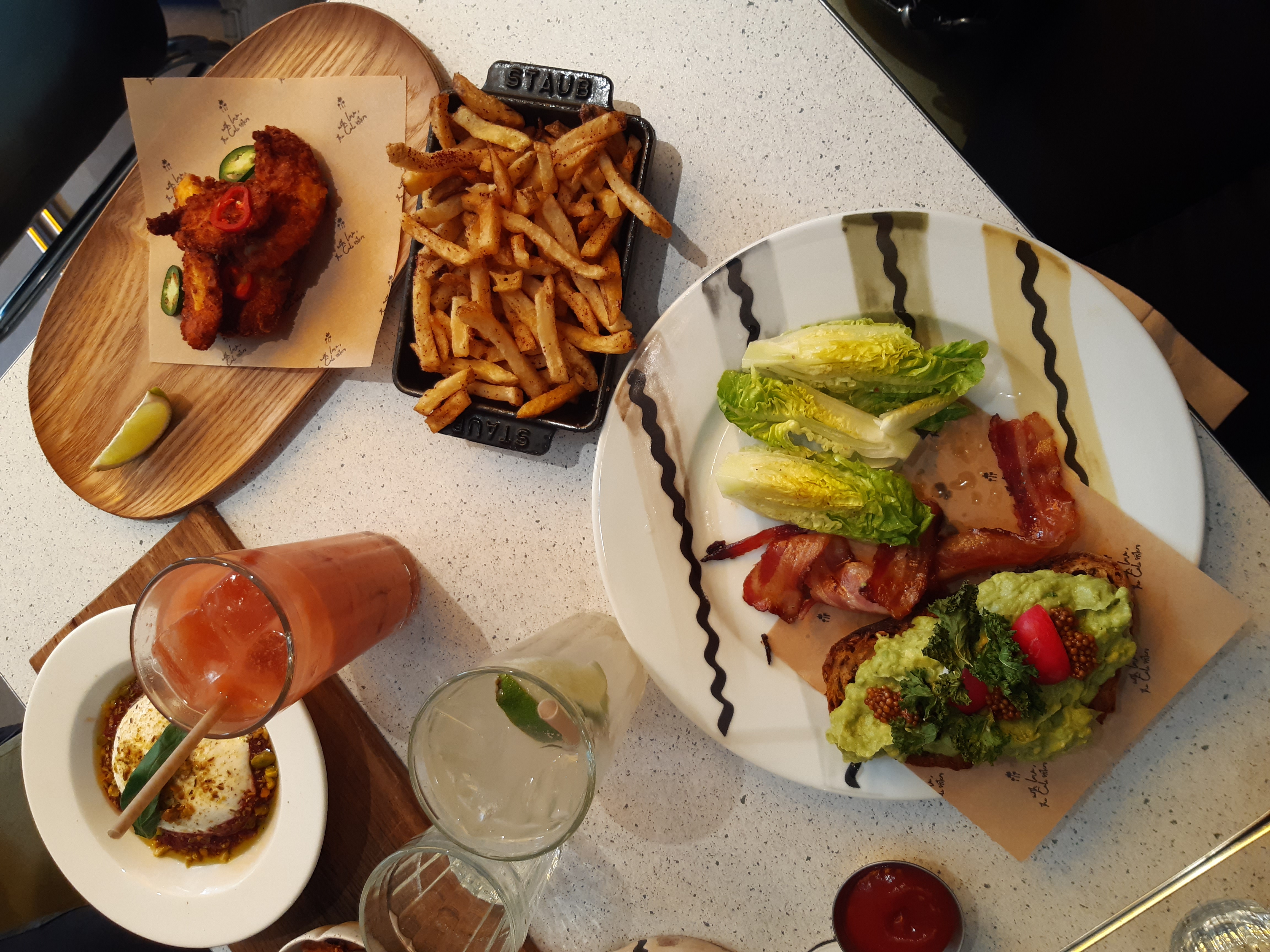 Nous avons aimé tout ce que nous avons mangé, notamment le crispy chicken qui est juste dingue. Le lobster bun est le plat qui nous a le moins emballé. Le rapport qualité/prix est beaucoup plus intéressant pour les autres plats. J'ai hâte de venir découvrir le reste, notamment le brunch. Le lieu est bien décoré et très grand, ce qui le rend agréable. Il y a également une petite terrasse