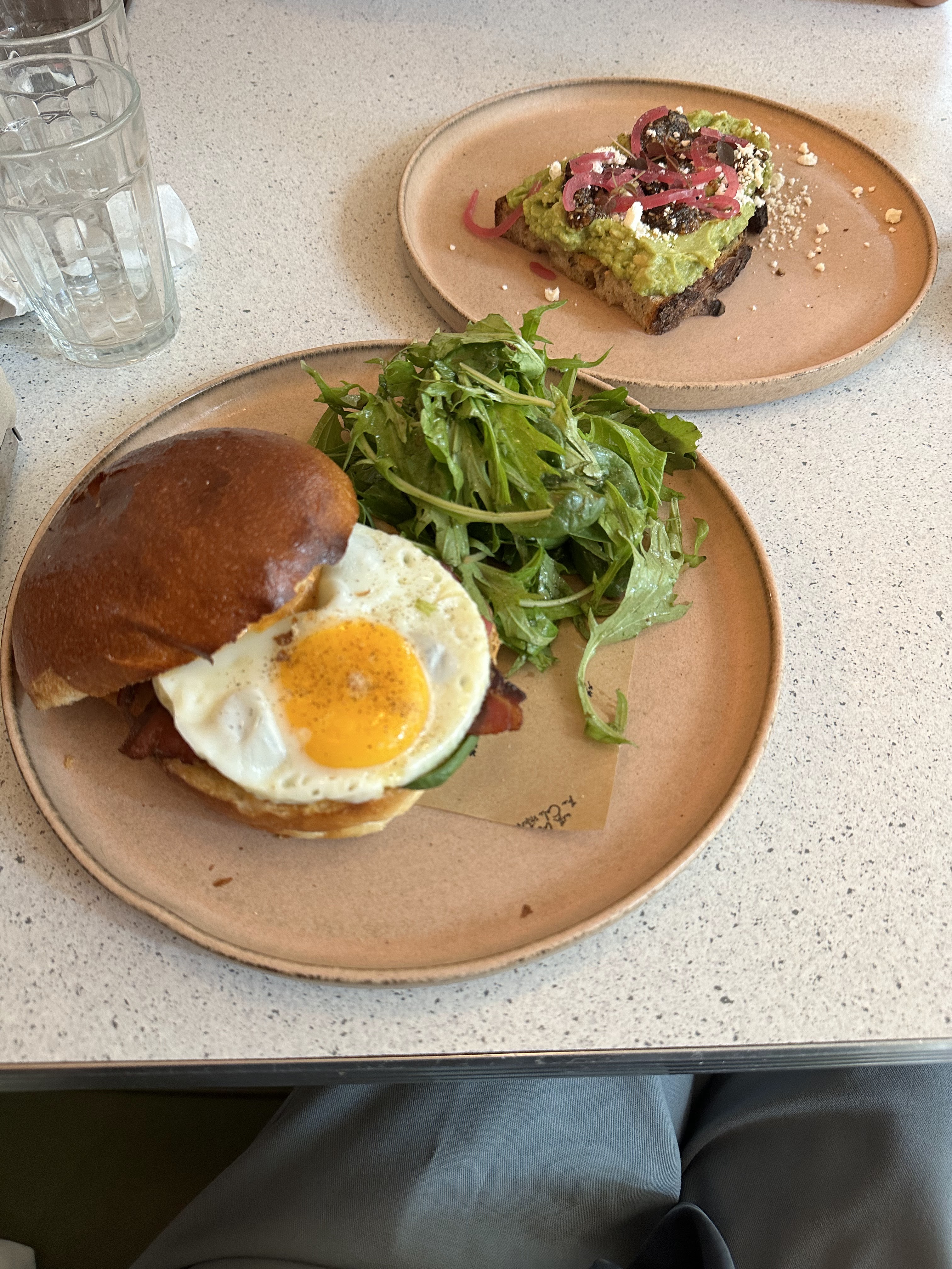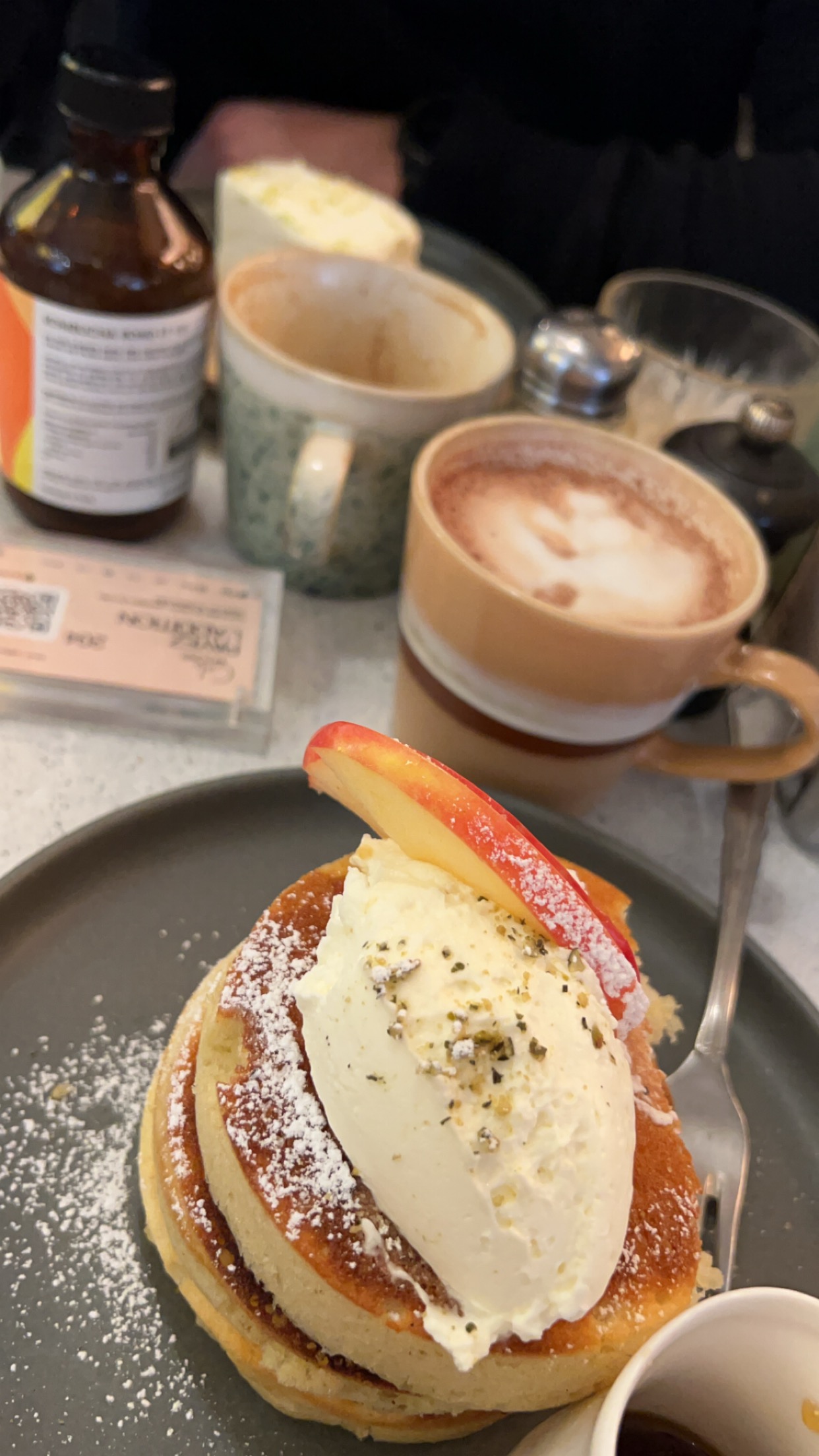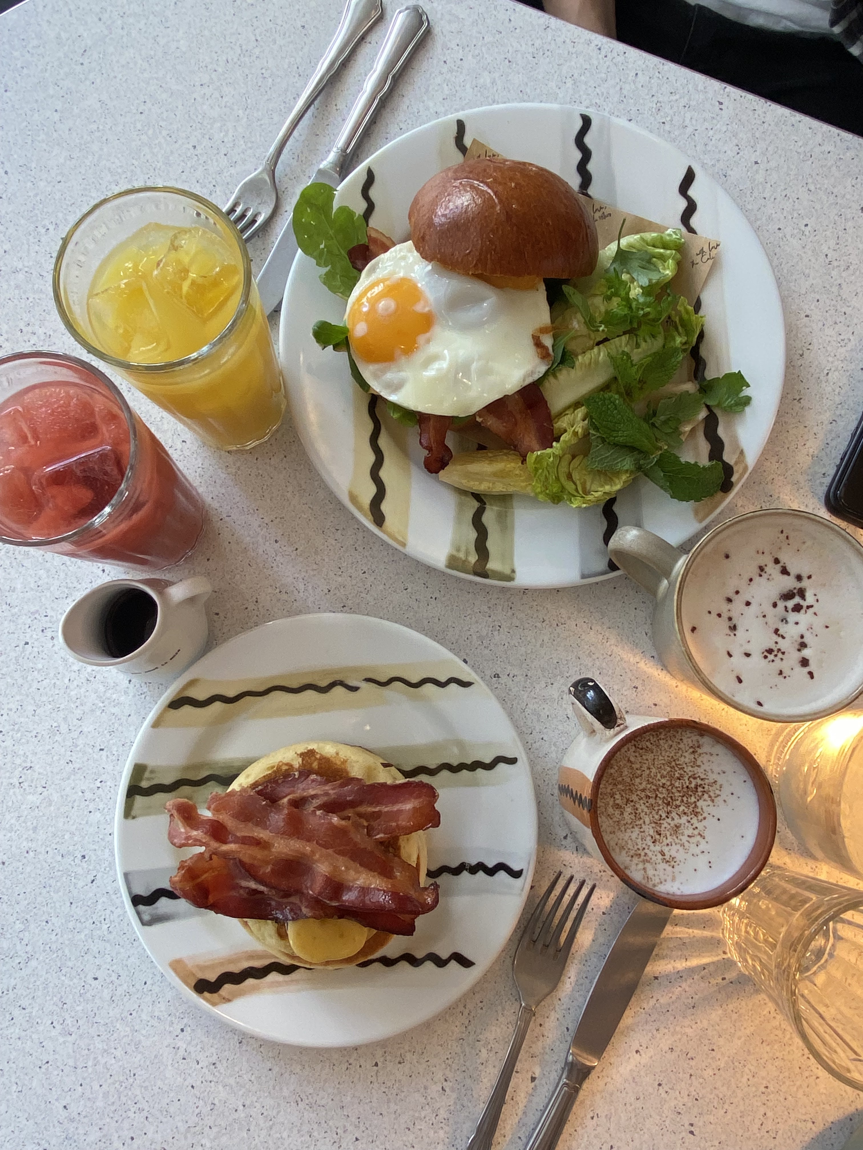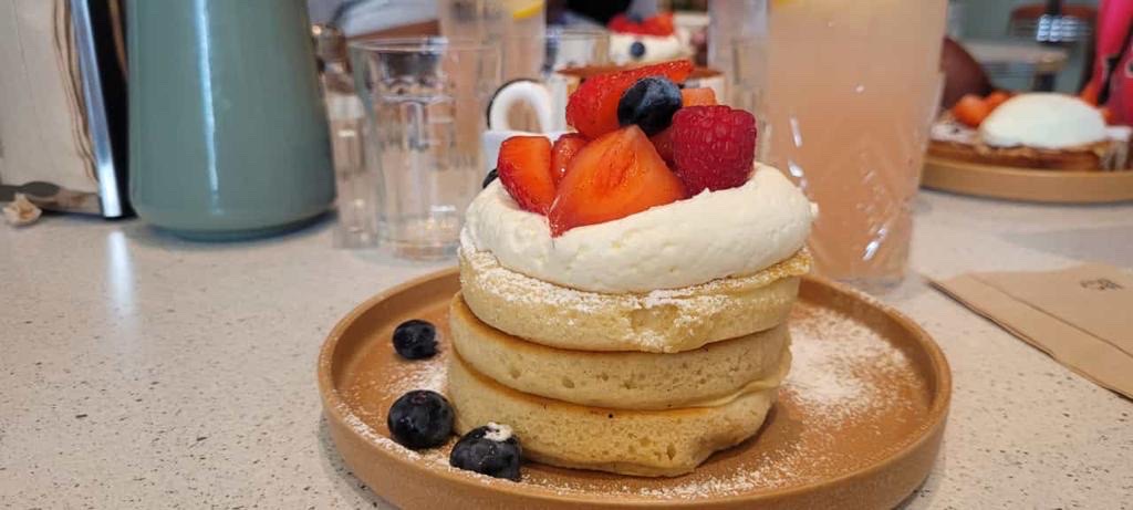 Service rapide. Le Perfect Egg est très bon avec le pain croustillant. Les pancakes sont un peu compacts mais j'aime beaucoup la source au caramel. Comme ils ont un service rapide, ils nous ont demandé de payer en scannant le code QR et créant un compte. On ne voulait pas le faire et on a attendu 3-5 minutes pour payer.