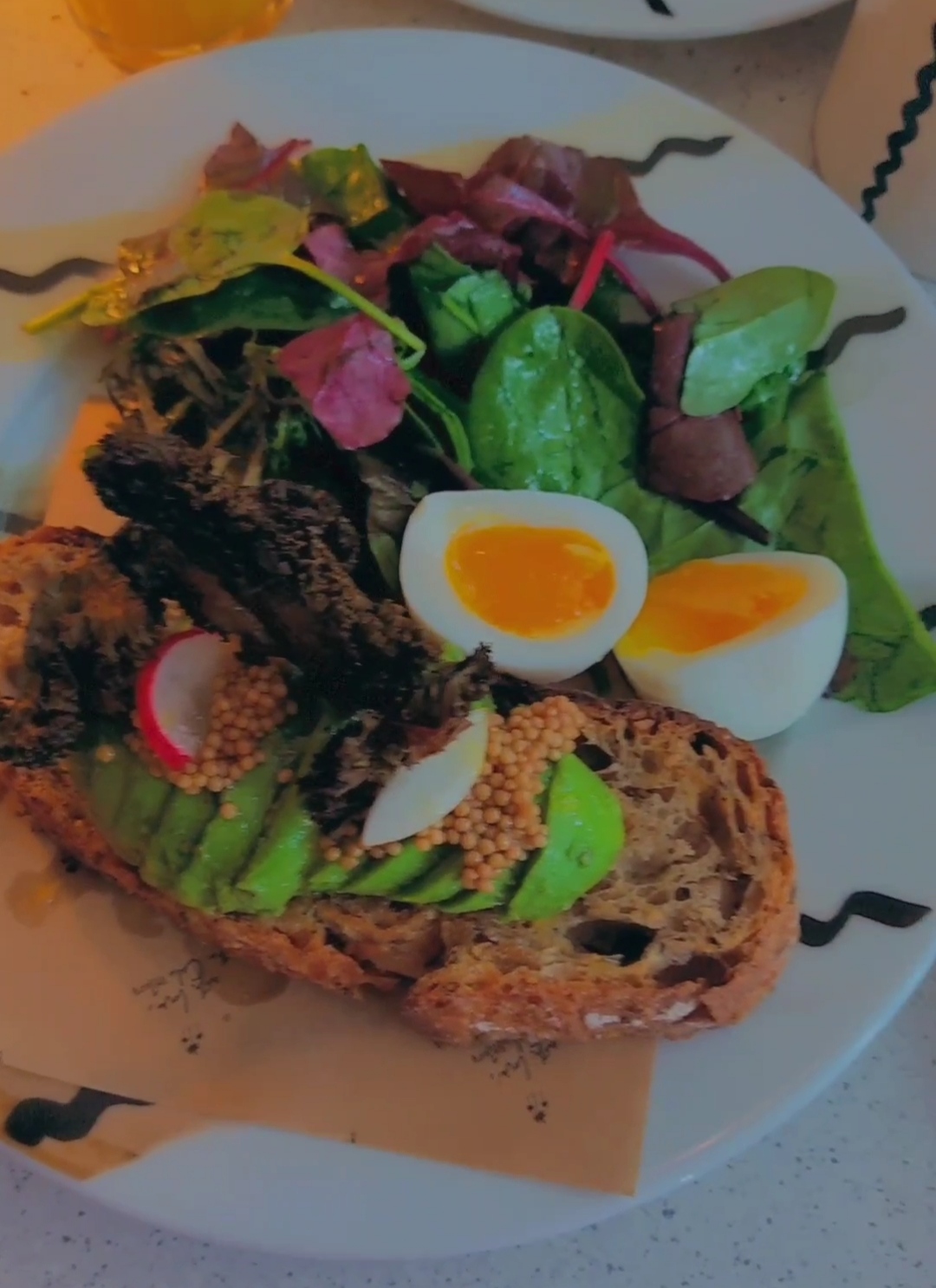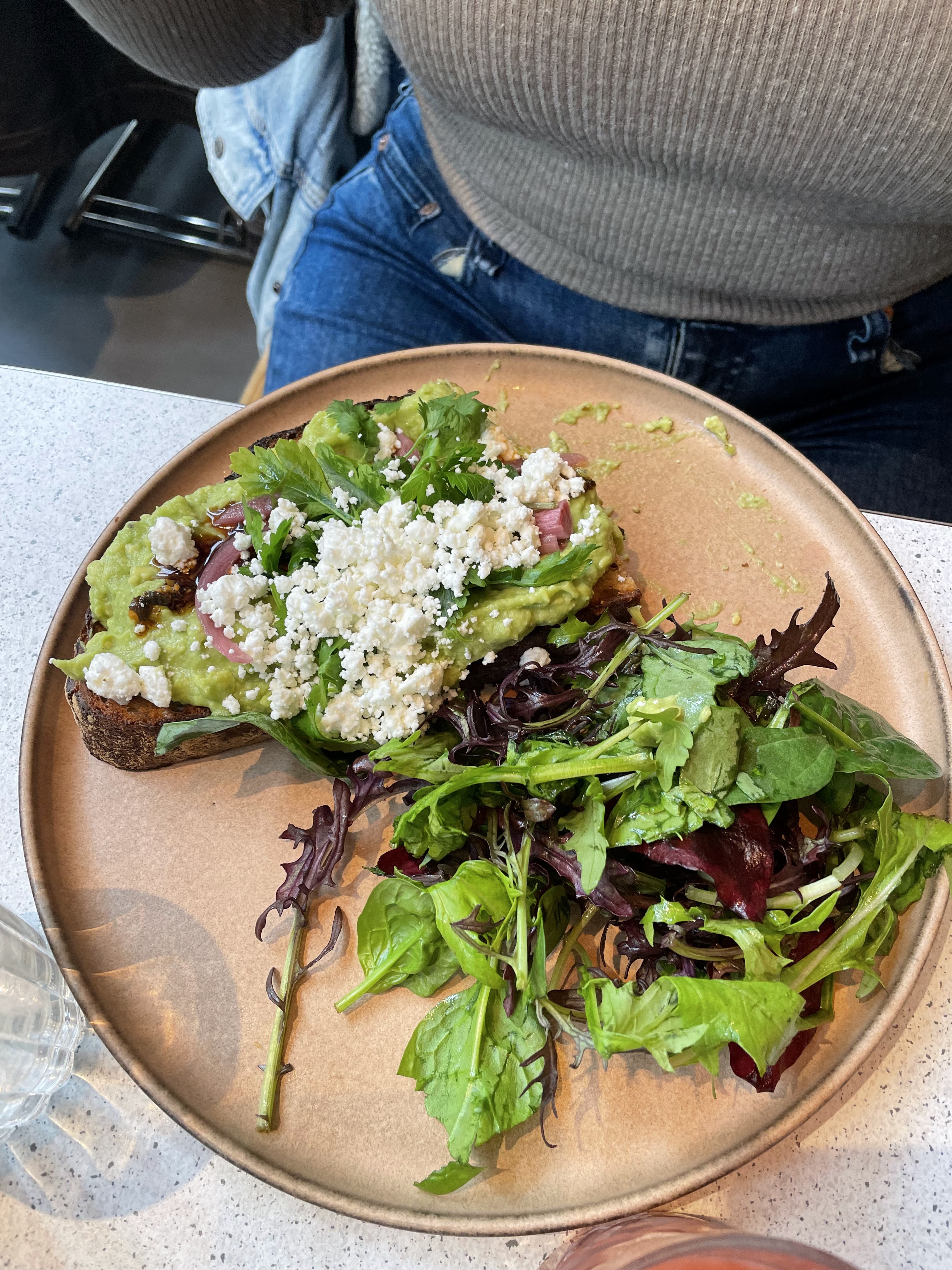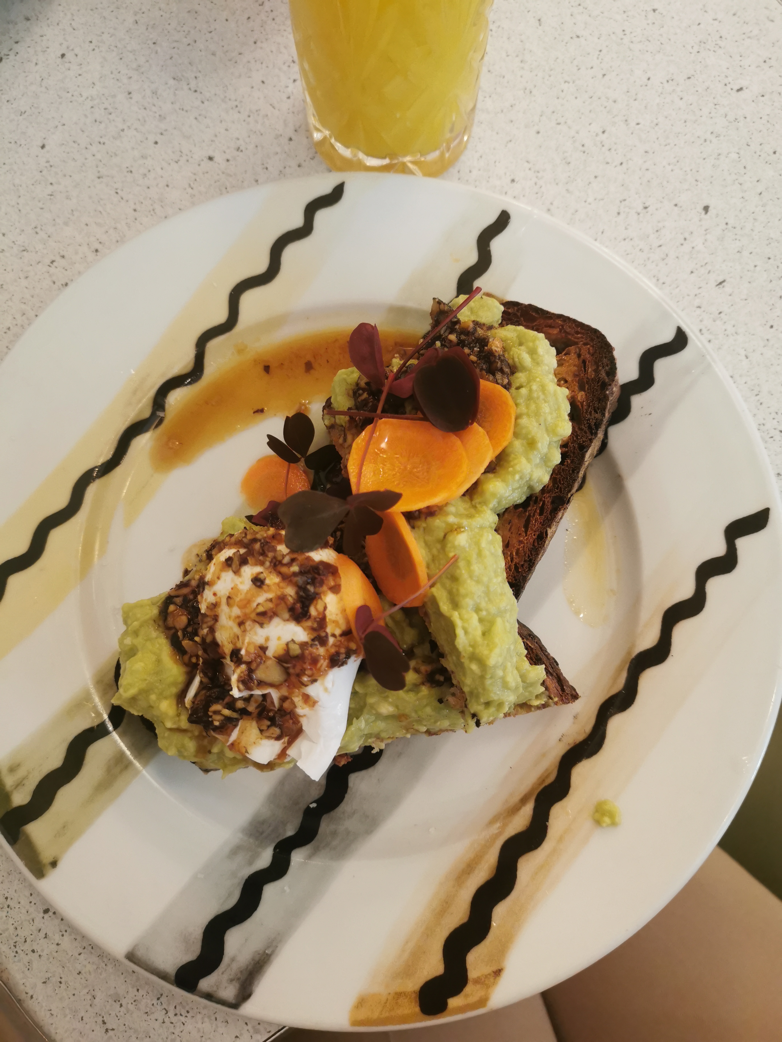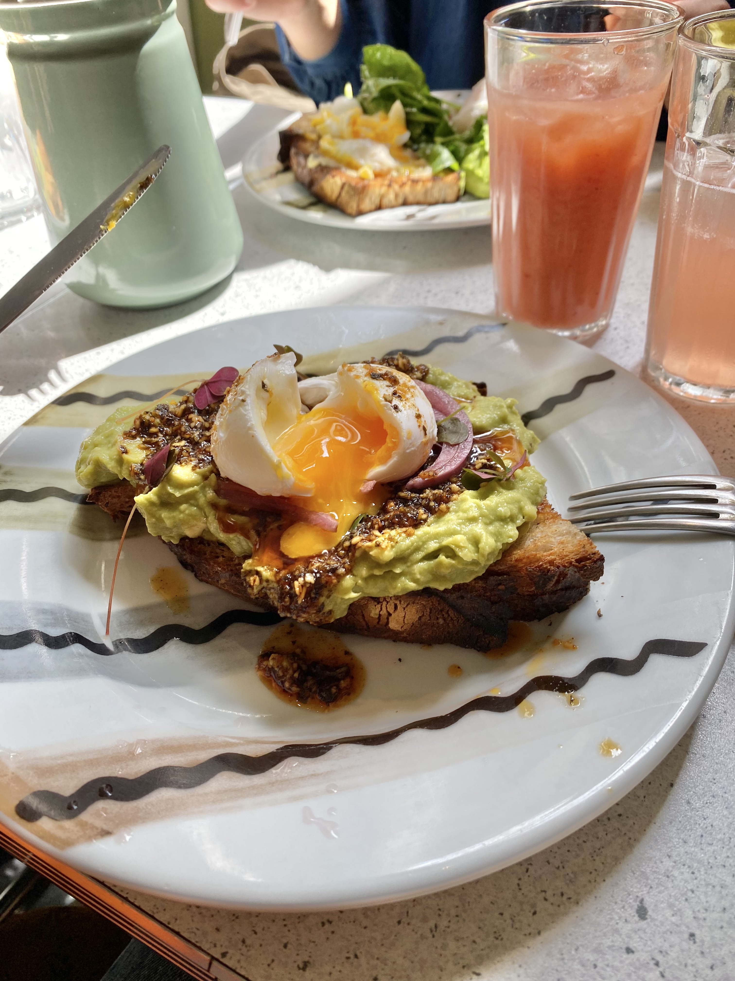 Vraiment déçue. On nous installés sans nous prévenir qu'il n'y a pas de choix à la carte le weekend, c'est donc un peu forcés que l'on a choisi la formule brunch à 29€ pour 2 assiettes et 2 boissons. Attention le cappuccino est - tenez-vous bien - à 2€ de supplément, ça fait cher la goutte de lait. Si comme moi vous faites le choix de l'avocado toast parmi la maigre carte, préparez-vous à vous contenter d'une portion qui ne remplit à peine que la moitié de l'assiette (photo à l'appui). Le goût est là mais pour le prix, on ressort avec la très amère et désagréable impression de se faire avoir.