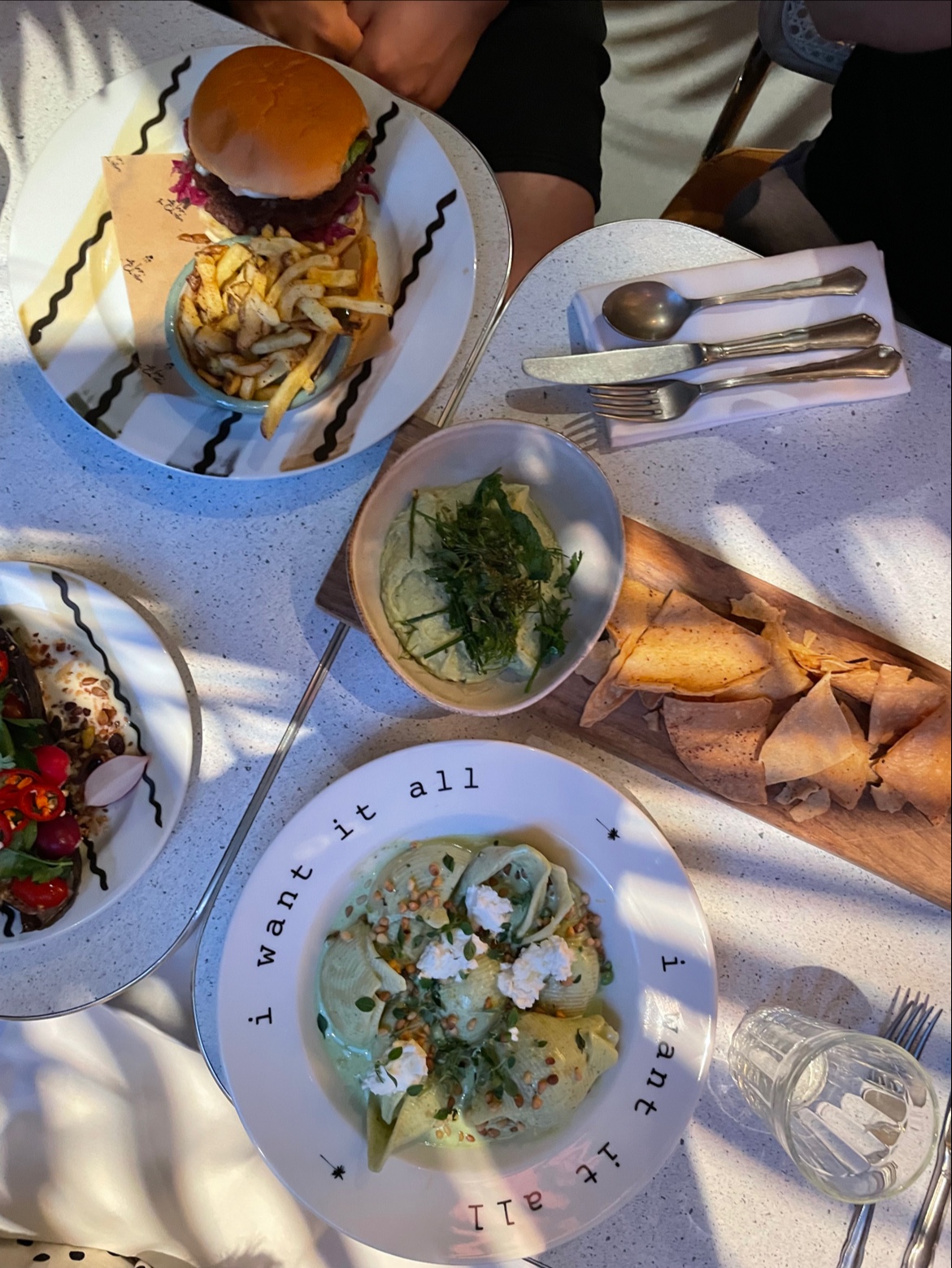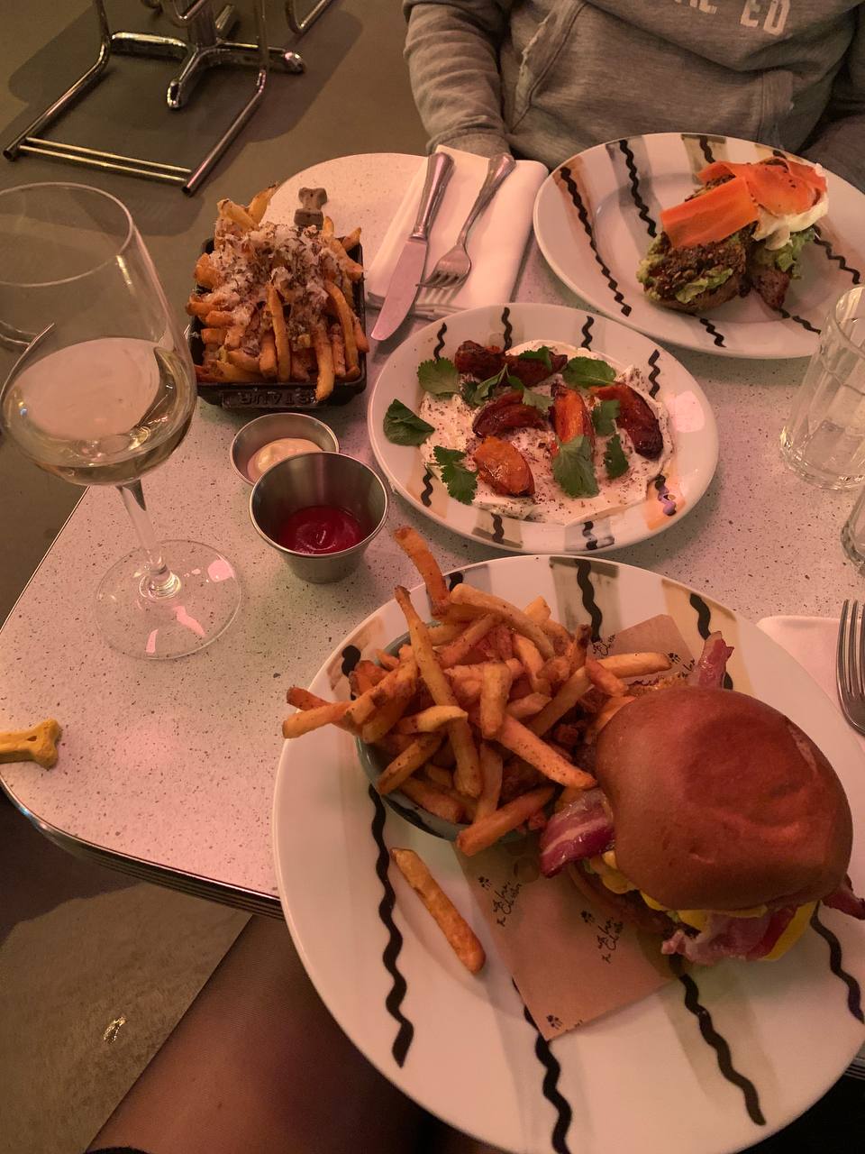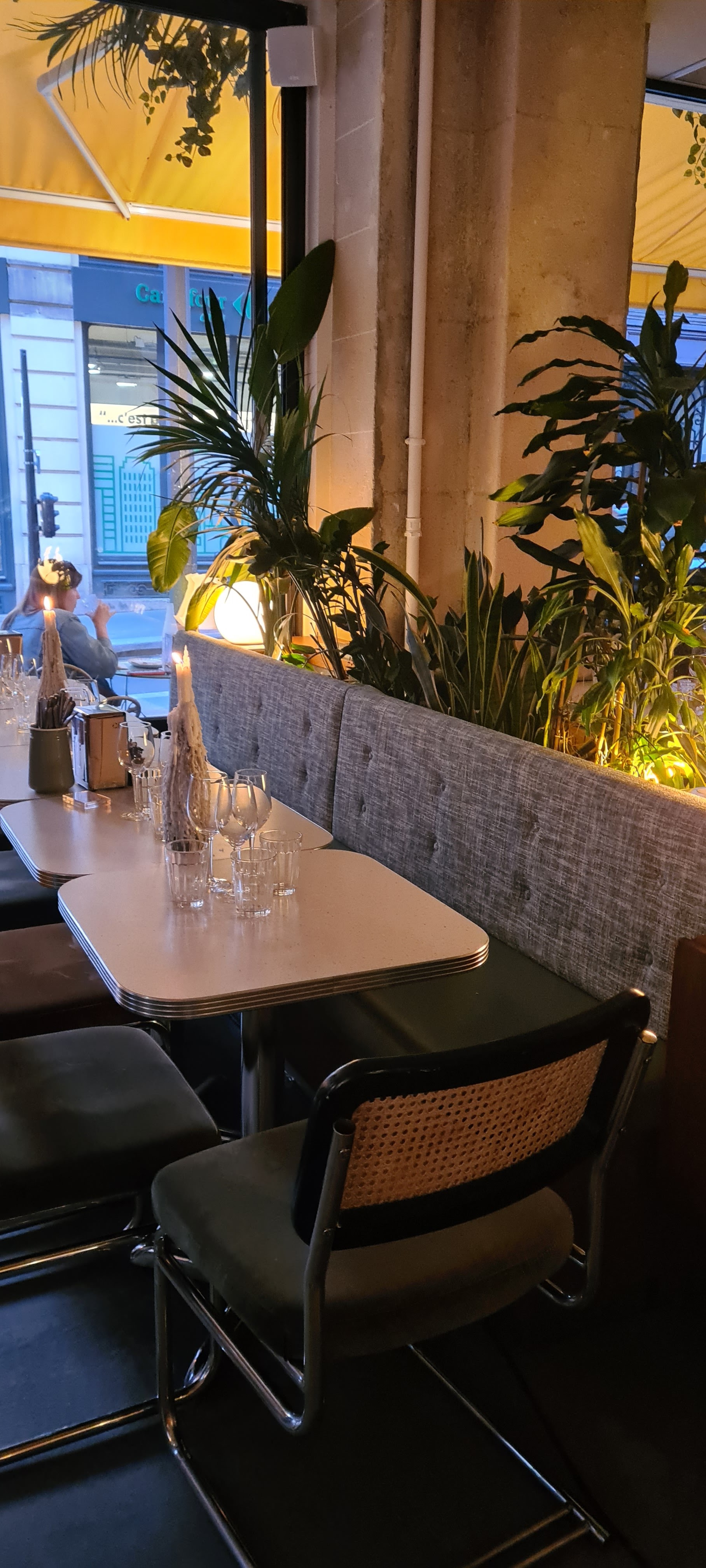 Tres joli lieu branché du 10ème. Réservation un vendredi soir. Cadre au top. Ambiance tamisée. Musique, plantes, décoration et banquettes qui nous projettent dans un décor de film. On adore. La carte est épurée, mais c'est pas plus mal, car ça présage de bons produits et une cuisine appliquée. Smash burger, meat balls, haloumi grillé et conchiglioni Verde composaient notre repas. C'était bon. Pas d'excès. Pas d'excentricité. Mais c'etait bon. La carte des cocktails est également très bien fournie. Pour un agréable moment de dépaysement, foncez!