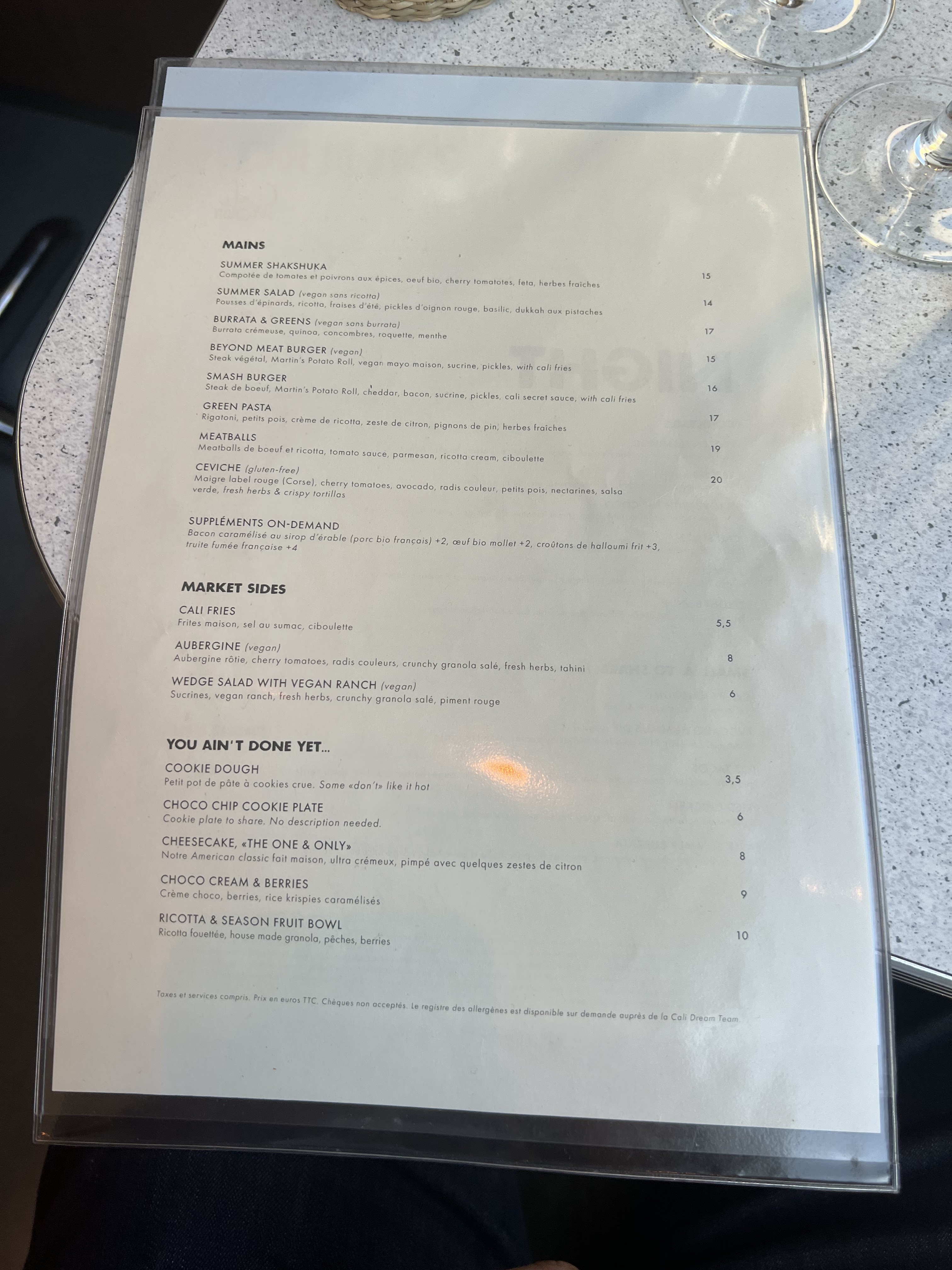 Cuisine healthy, c'est la promesse de ce restaurant aux influences californiennes ! Pour commencer une belle liste de cocktails et boissons. Nous avons choisi de prendre un plat et un accompagnement mais ce n'est pas obligatoire. Les plats sont assez copieux. Bon point aux boulettes de boeuf en sauce tomate, un régal avec une belle tranche de pain toasté pour profiter de la sauce. Le lobster bun, sorte de hamburger au homard, est lui aussi excellent avec sa petite salade. Petit bémol sur l'aubergine fondante, la sauce préparée à base de tahini (pâte de sésame) est un peu trop sucré en raison du miel ajouté à la préparation. La sauce aurait gagné en équilibre en ajoutant plus d'acidité dans la préparation. Pour finir, les desserts sont très bons et peu sucrés, le bon équilibre !