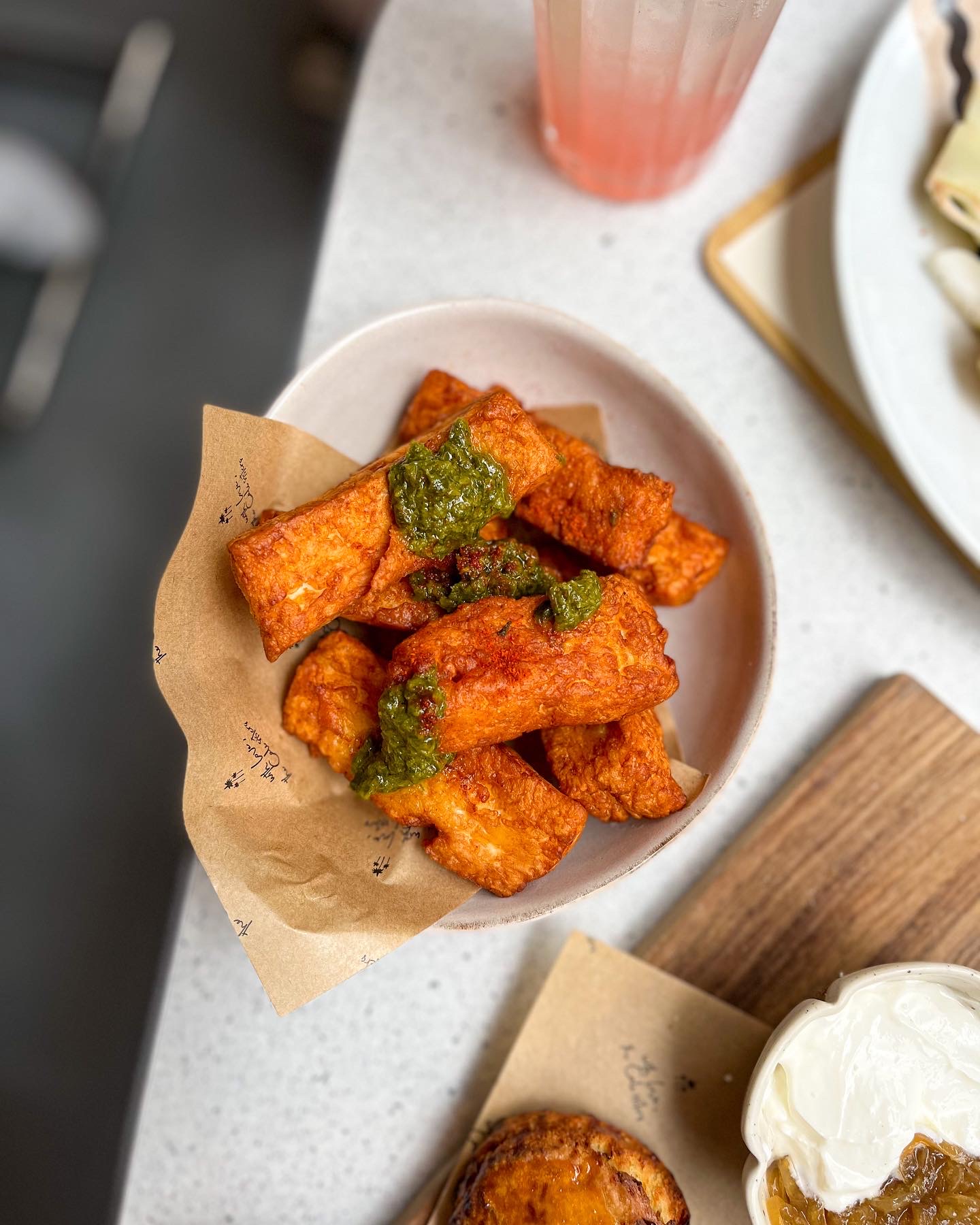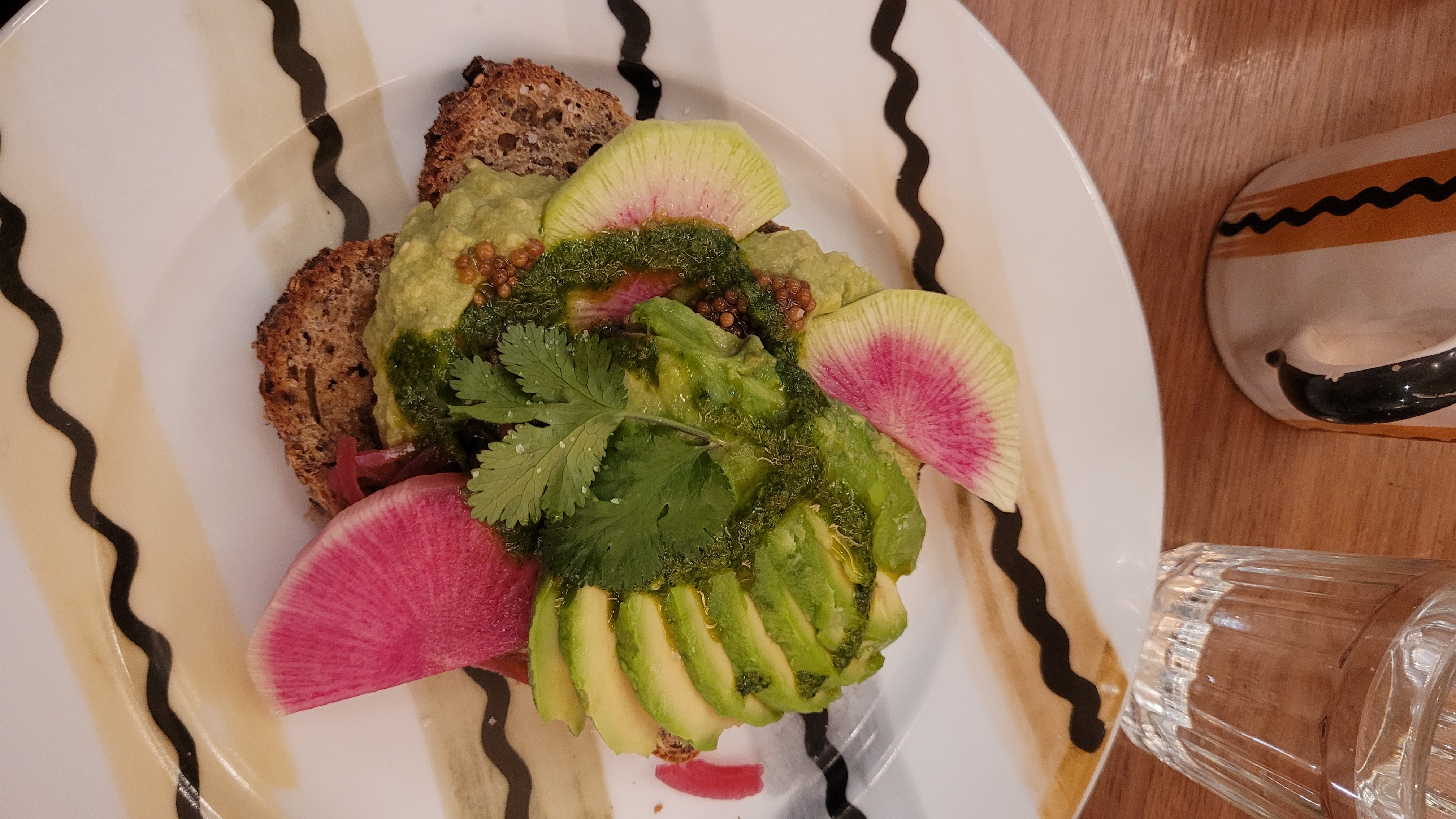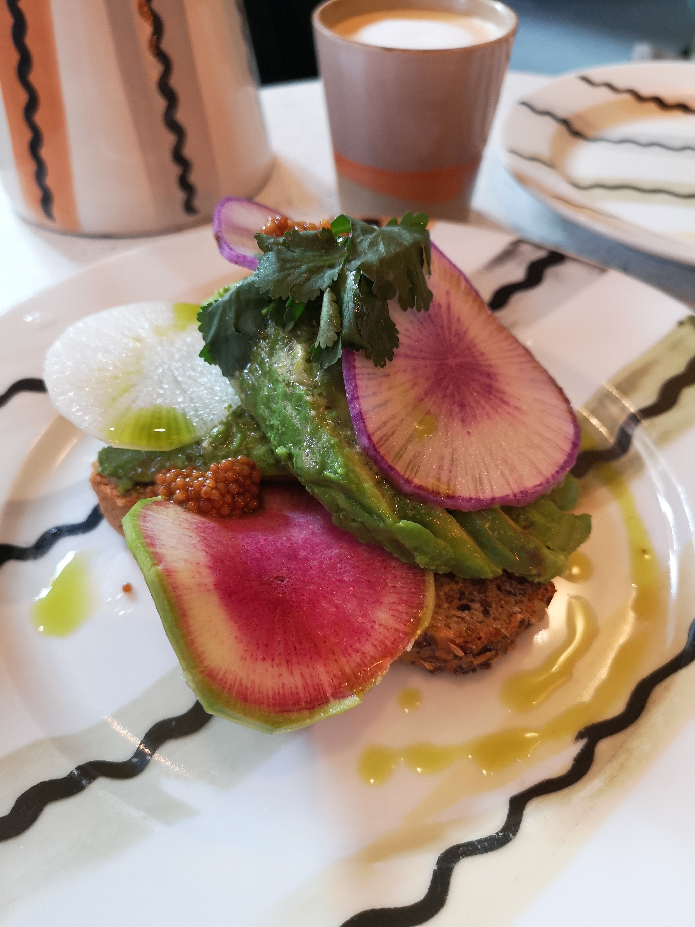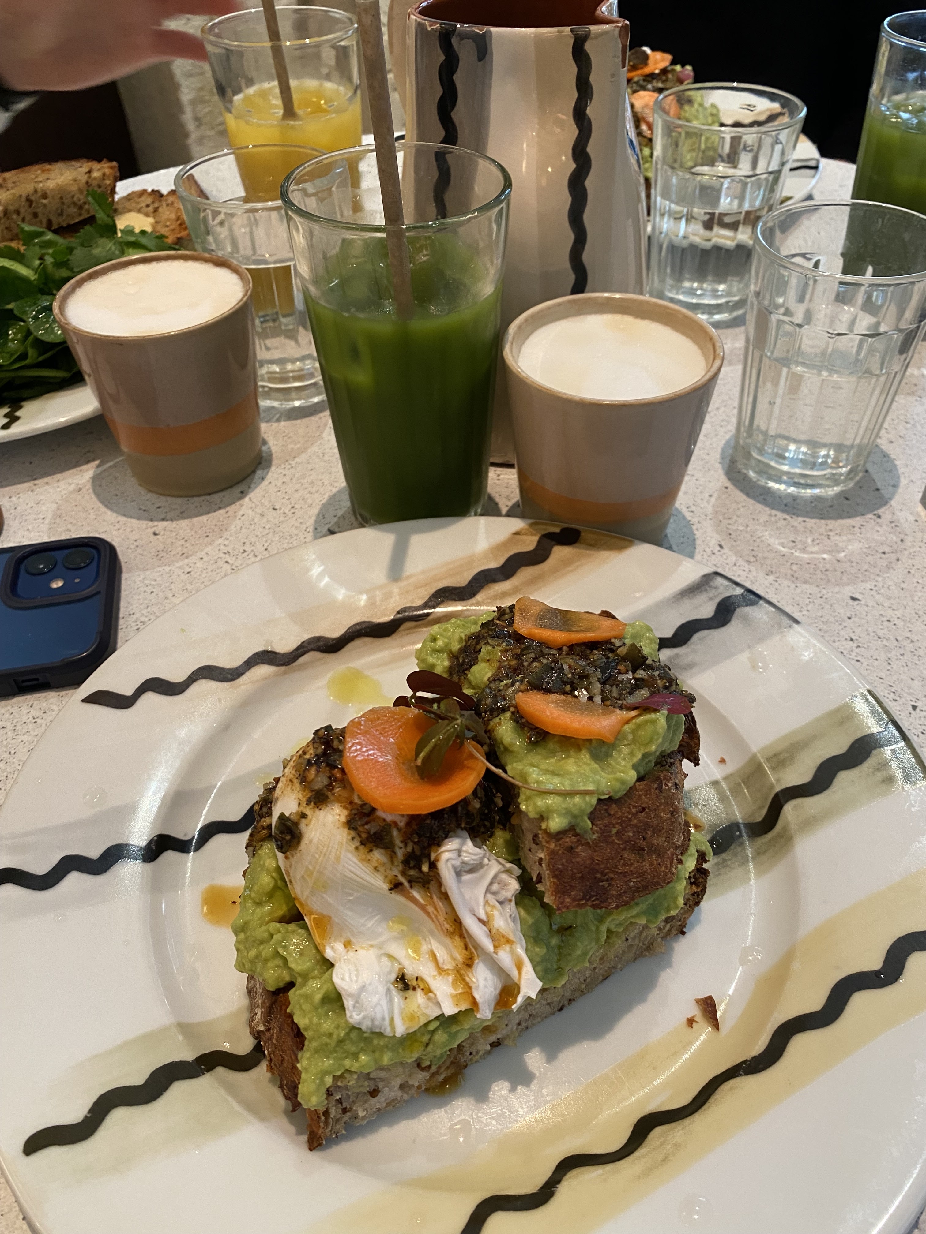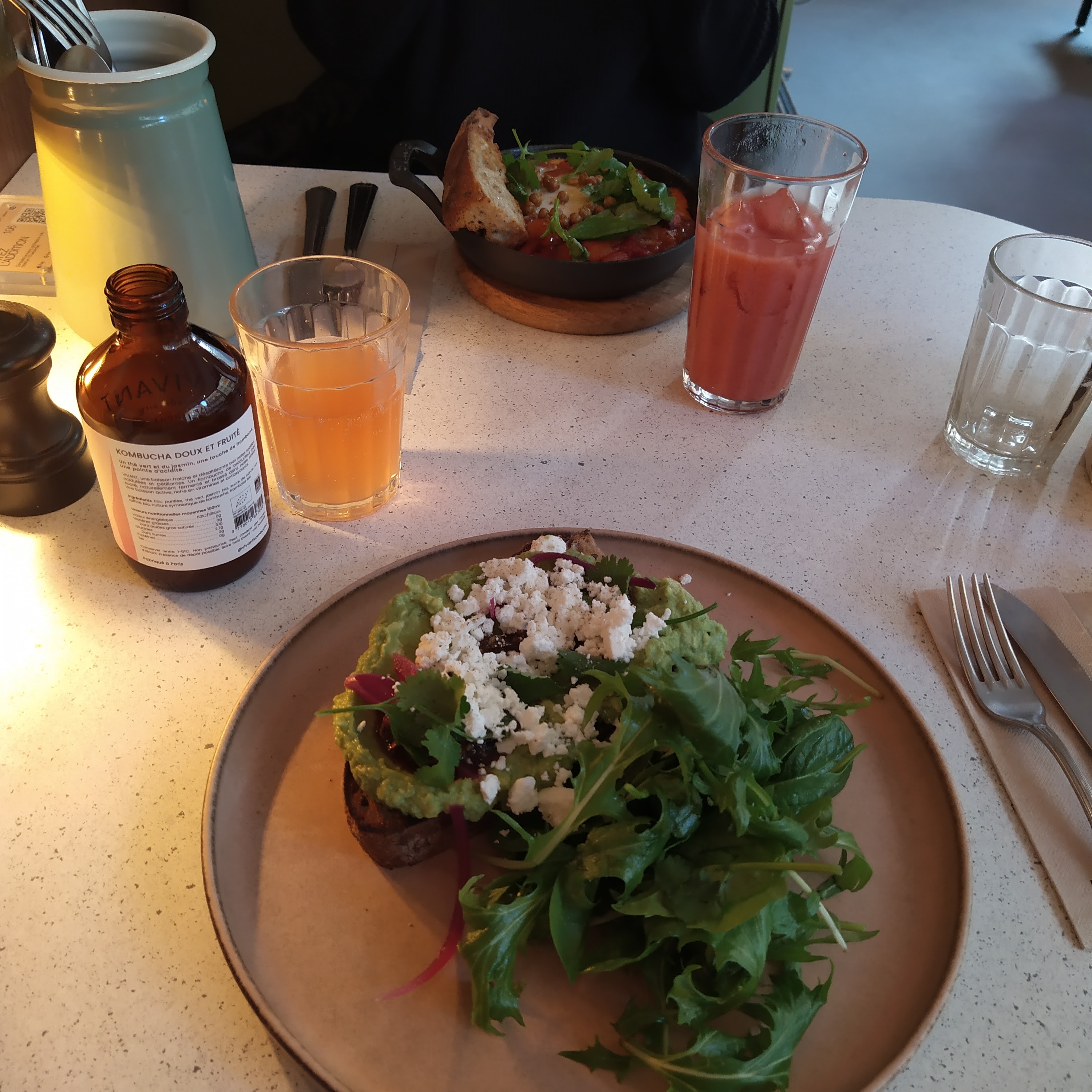 Ambiance et décoration très cool et je suis fan de leur vaisselle. J'ai été servie par une des deux gérantes, très sympa. Avocado toast original, j'ai beaucoup aimé la combinaison avec les chips de kale et le chou romanesco. Prix parisiens, on finit par s'habituer ;)